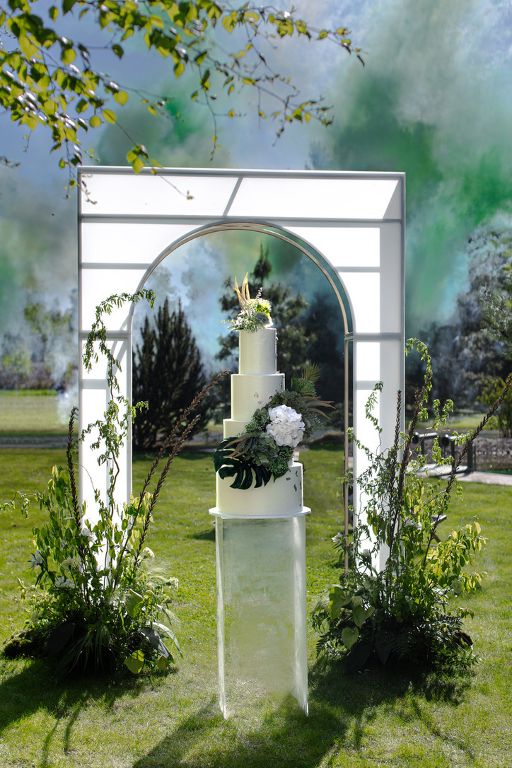 Elegancki stelaż w kształcie łuku i dwóch kolumn wykonany z metalu, pomalowany na kolor złoty. Od frontu zawiera panel plexi w kolorze mleczno-białym. Stanowi bazę do stworzenia stylowej dekoracji glamour. Można udekorować go kwiatami i zaaranżować w salach o wyższym sufcie. Sprawdzi się jako dekoracja plenerowa miejsca zaślubin przy ustawieniu konstrukcji na stabilnym podłożu. Idealny jako dekoracja do serwisu tortu. Element skłąda się z trzech modułów.